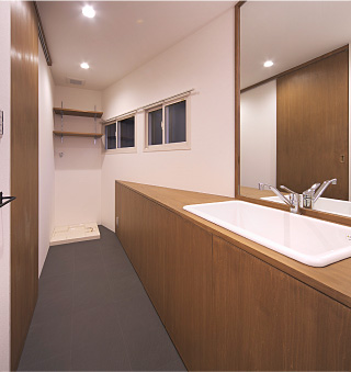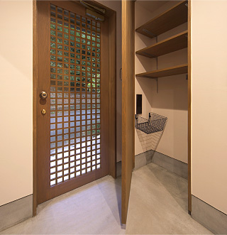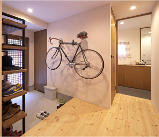 土間の幅を広げ、自転車ハンガーのある開放的な玄関に