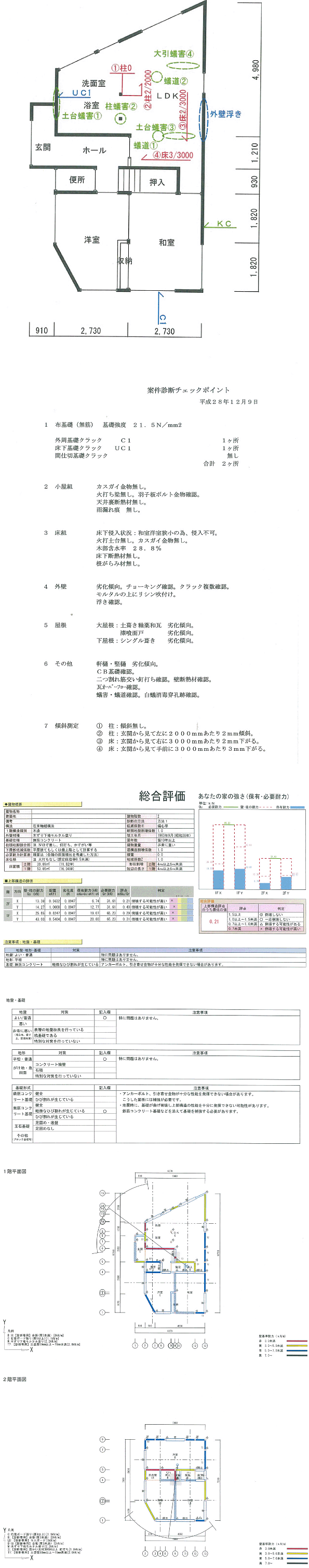 築年数の経過した木造住宅の基礎には比較的クラック(ひび割れ)の発生が目立ちます。木造住宅の基礎は布基礎で連続していないと地震発生時にゆがみを生じます。基礎コンクリートが割れている場合は、その一体性を保つ為にクラック部の補修が必要になります。そこで、目視でクラックの有無を確認しコンクリートの圧縮強度の測定を行い、センサーを使い鉄筋の有無を確認する事で、基礎の状態を調べます。